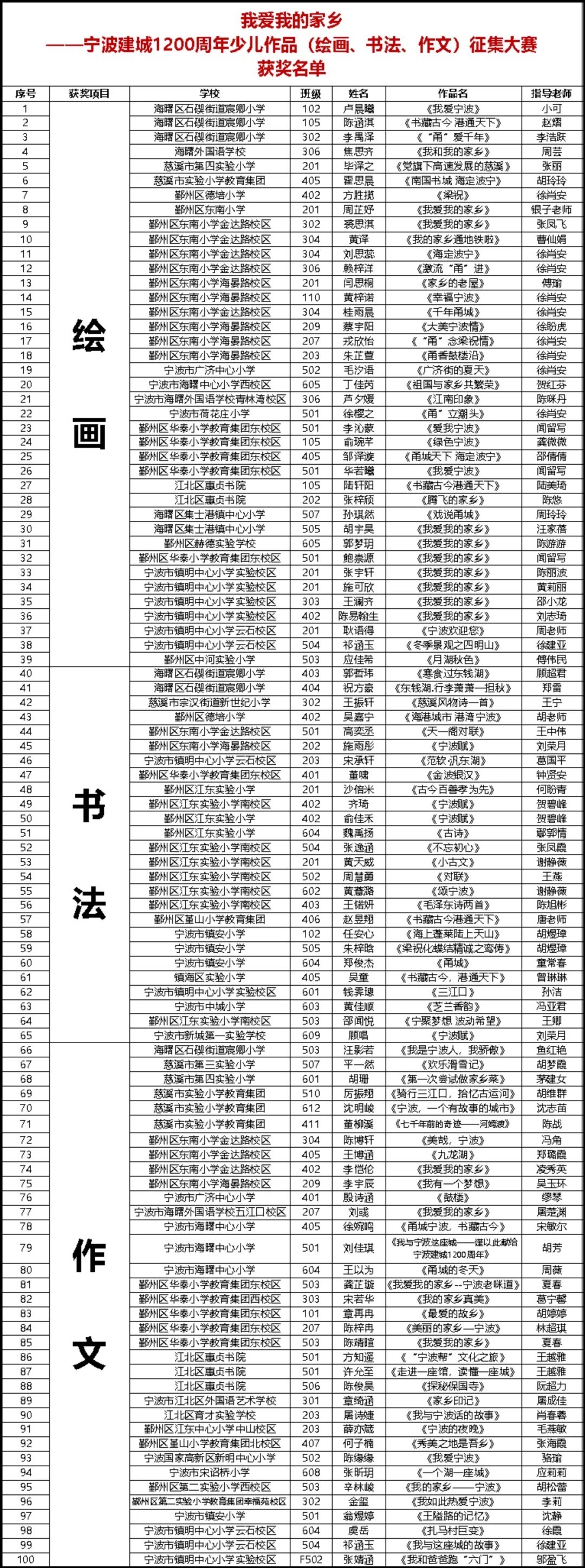 12月1日, 由宁波市委宣传部指导,宁波市档案馆承办,宁波广播电视《都市周报》协办的“我爱我的家乡”——宁波建城1200周年少儿作品(绘画、书法、作文)征集大赛启动以来,得到广大学校、老师、学生和家长的热烈响应,短短10天作品征集期就收到参赛作品1167件。评委组通过3天紧张而又细致的评选工作,最终评选出100件优秀获奖作品,具体名单如下: